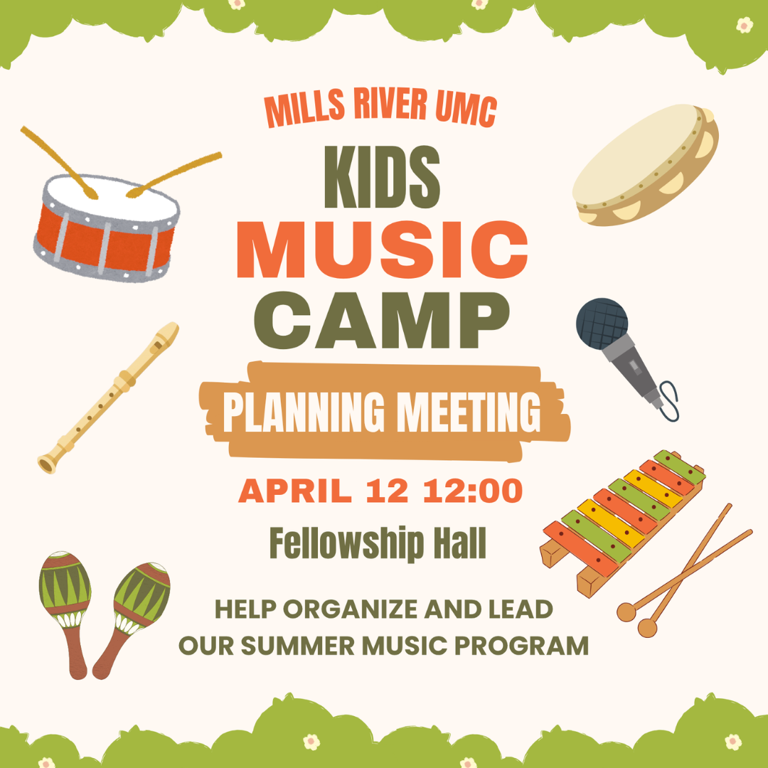 Join us after the 11:00 worship Service on Sunday April 12 as we begin planning for our children's programming this summer, which will be a Music Camp for 3-11 year old’s! This will need to be a team effort, if you're interested in being a group leader, leading music/ craft lessons, or helping in many different ways, we'd love to hear your voice on April 12th as we begin planning! Please reach out to kelley@millsriverumc.org if you have any questions.