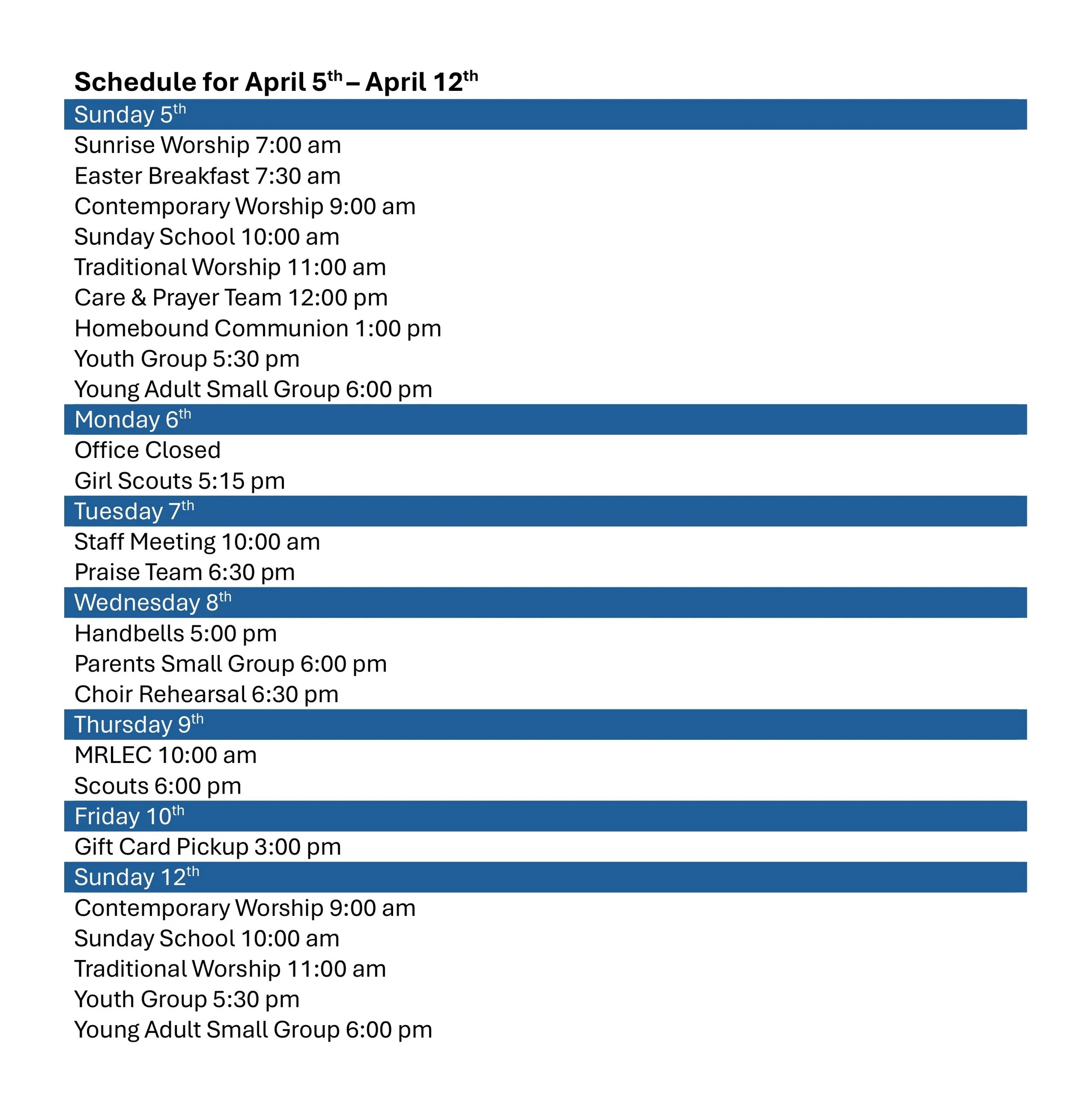 Back to All Events Weekly Schedule Sunday, April 5, 2026 8:00 AM Sunday, April 12, 2026 9:00 AM Google Calendar ICS
