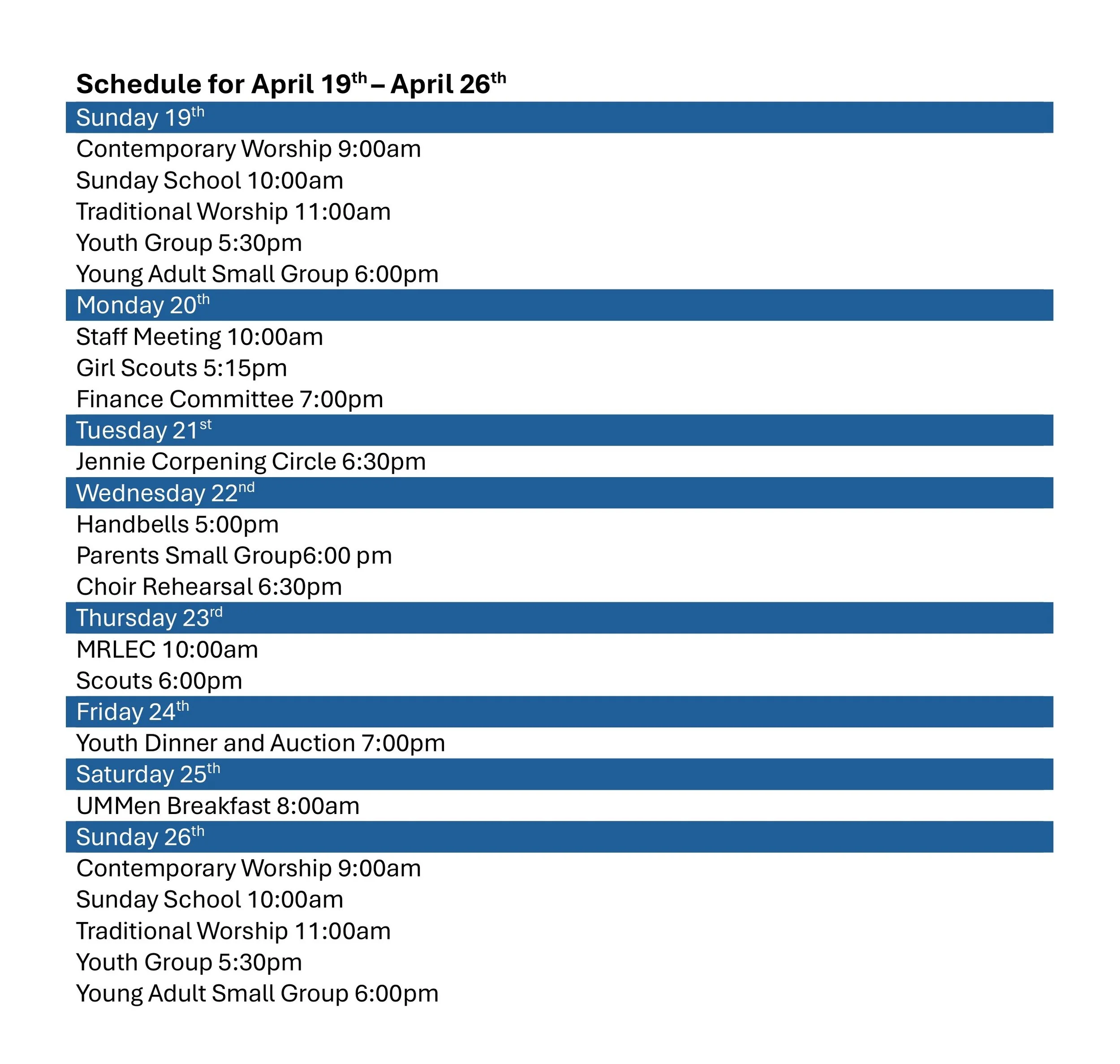 Back to All Events Weekly Schedule Sunday, April 19, 2026 8:00 AM Sunday, April 26, 2026 9:00 AM Google Calendar ICS