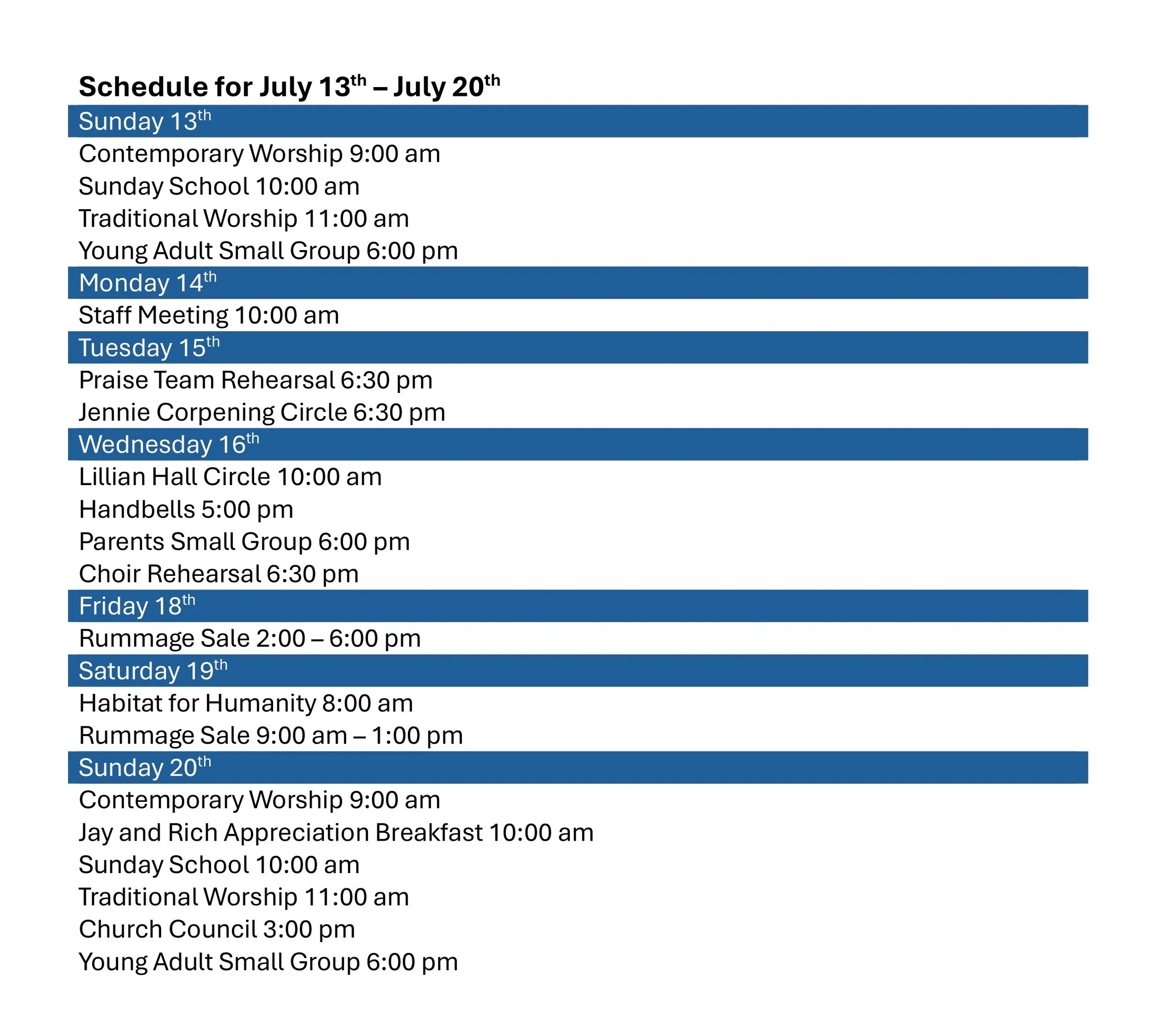 Back to All Events Weekly Schedule Sunday, July 13, 2025 8:00 AM Sunday, July 20, 2025 9:00 AM Google Calendar ICS